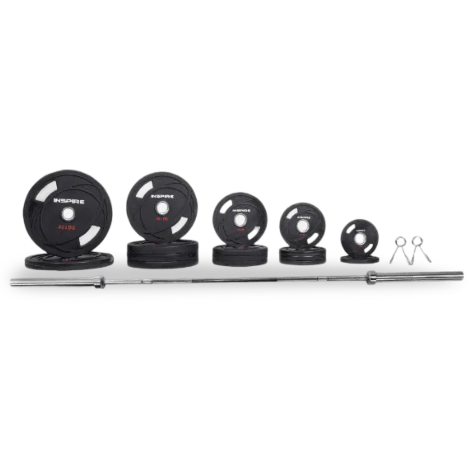 The set includes 2 X 45 Lb plates, 4 x 25 Lb plates, 4 x 10 Lb plates, 4 x 5 Lb plates, 2 x 2.5 Lb plates, 2 x clips, & Olympic Bar.