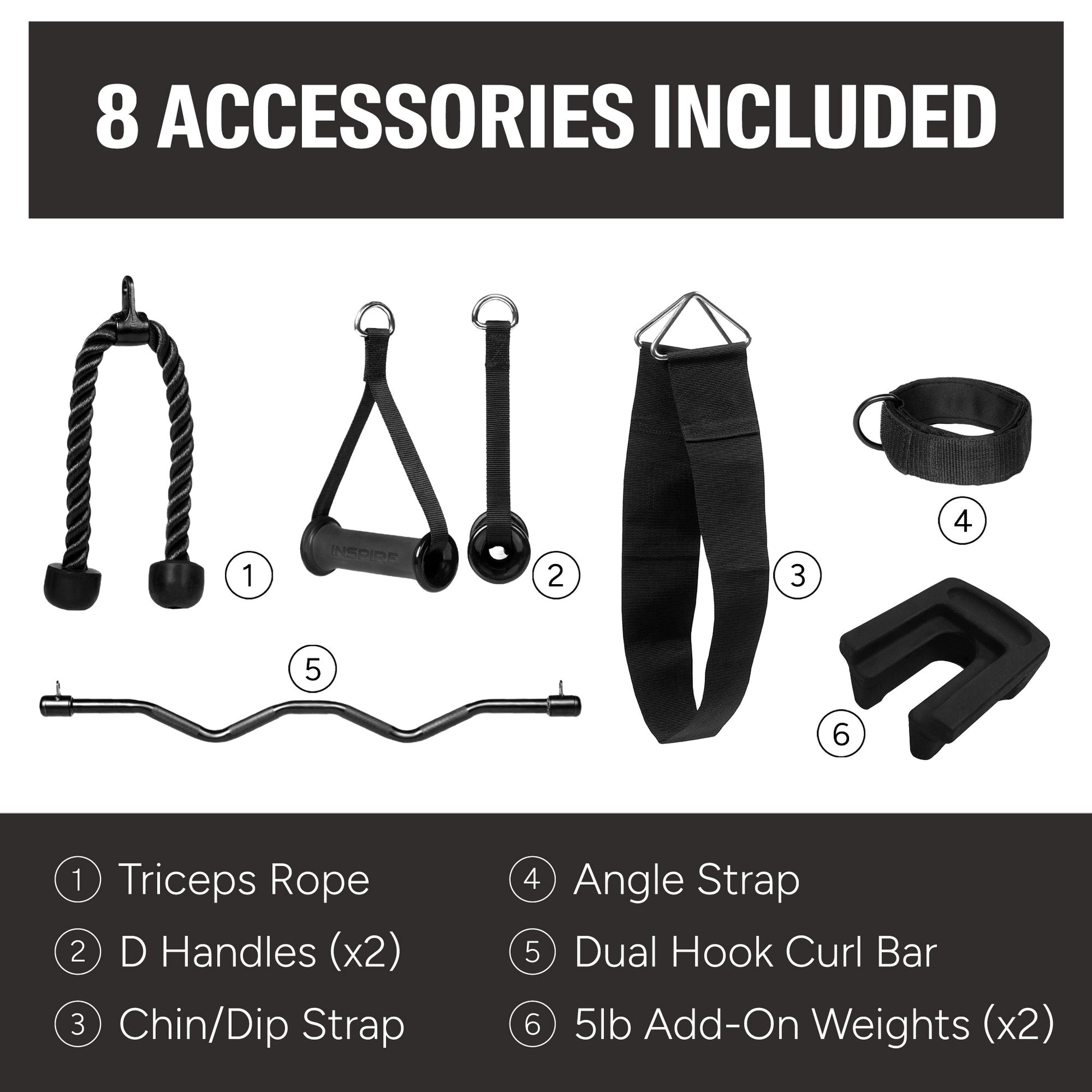 8 ACCESSORIES INCLUDED: Triceps Rope, Dual Hook Curl Bar, Ankle Strap, (2) D Handles, Multi-Purpose Belt, and (2) 5lb Add On Weights